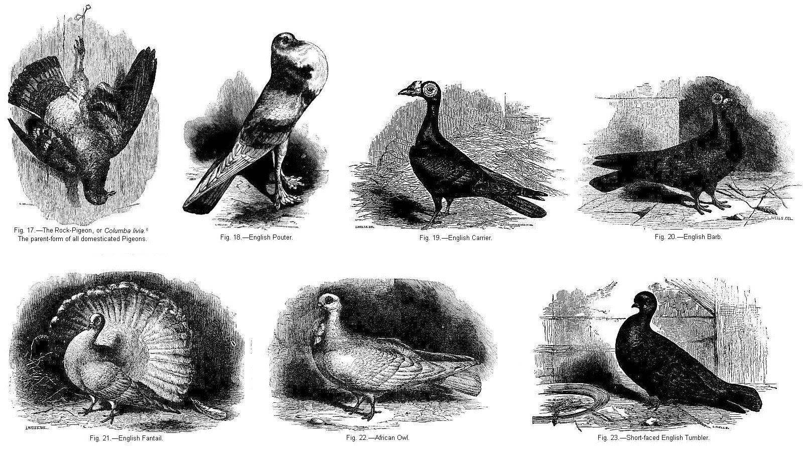 | 所有馴化鴿和野鴿都屬於同一個物種(species),但被馴化選育的各種鴿子則是該物種之下的人工品系(breed)。圖片來自達爾文在1868年所著的The Variation of Animals and Plants under Domestication。 |